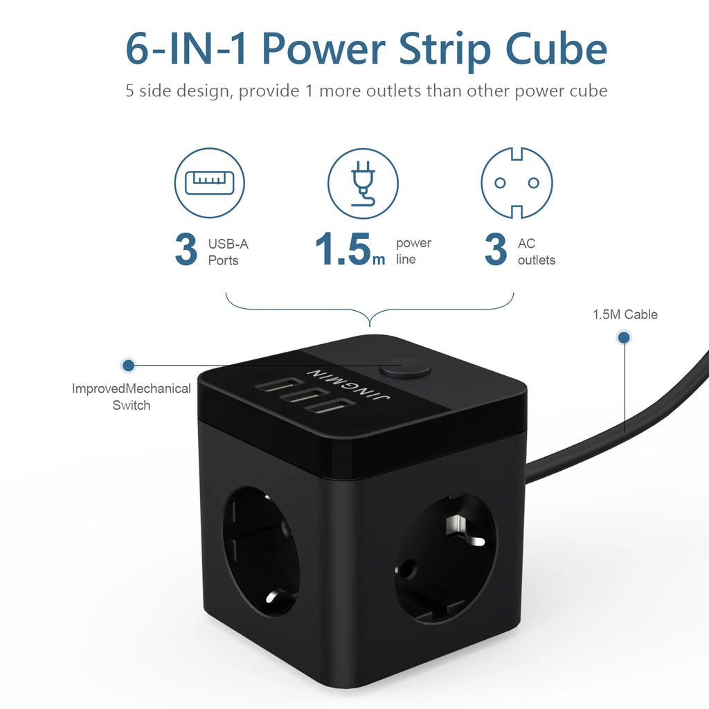 JINGMIN 6-in-1 cube USB power strip with switch