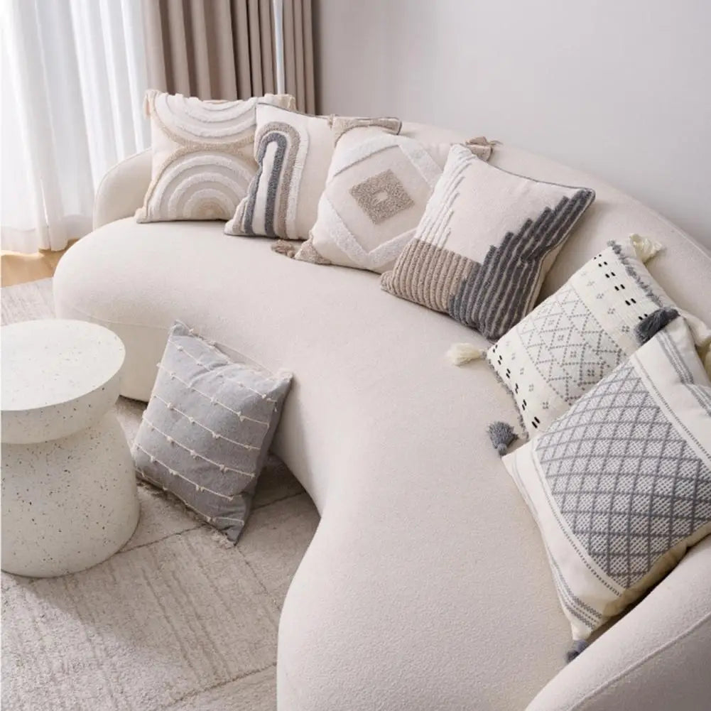 Enhance your home decor with our luxurious and durable neutral throw pillow covers. Featuring a unique braided rope pattern with soft tufts of two colors, these pillowcases add a touch of elegance to your sofa, chair, or bedding. Handmade tassels adorn the corners, adding a cute and charming touch that won't easily fall off.