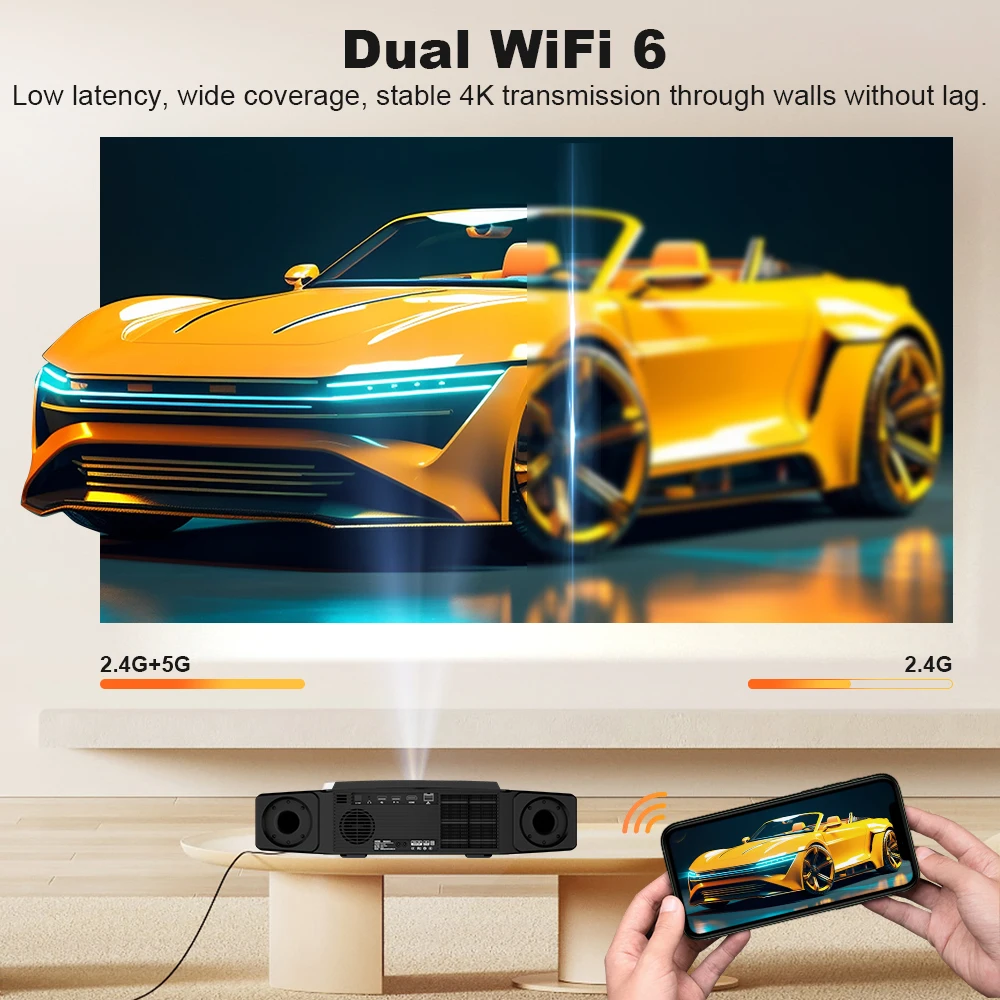 Projetor 4K de alta definição equipado com Wi-Fi duplo + Bluetooth 5.2, foco automático e prevenção de obstáculos, viva-voz! Projete um cinema de 100 polegadas na sala de estar da família, projete uma tela gigante de céu estrelado para acampamentos ao ar livre e jogue com baixa latência e sincronização. Projetor portátil com alto-falantes Hi-Fi integrados, áudio e vídeo sincronizados para chocar cada cena.